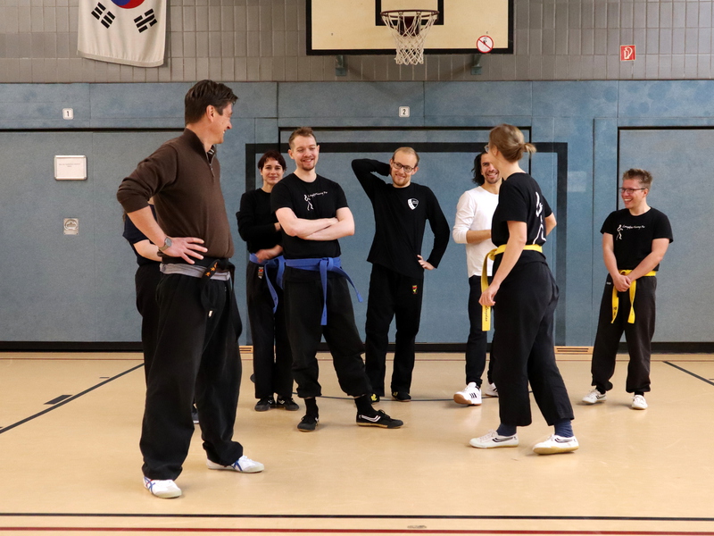 Aber auch der gelbe Gurt, der erste Grad im Kung Fu, hat es durchaus in sich: Neben grundlegenden Selbstverteidigungstechniken werden hier unter anderem auch Kraft- und Körperbeherrschungsübungen gezeigt, die einen im wahrsten Sinne ganz schön ins Schwitzen bringen.